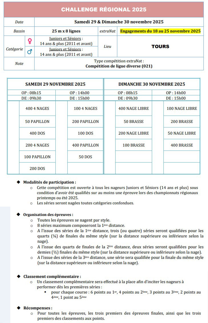 | U14 et plus | 29/11 → 30/12 | Challenge régional | TOURS | FFN | Reg | Oui | Voir | X | X |