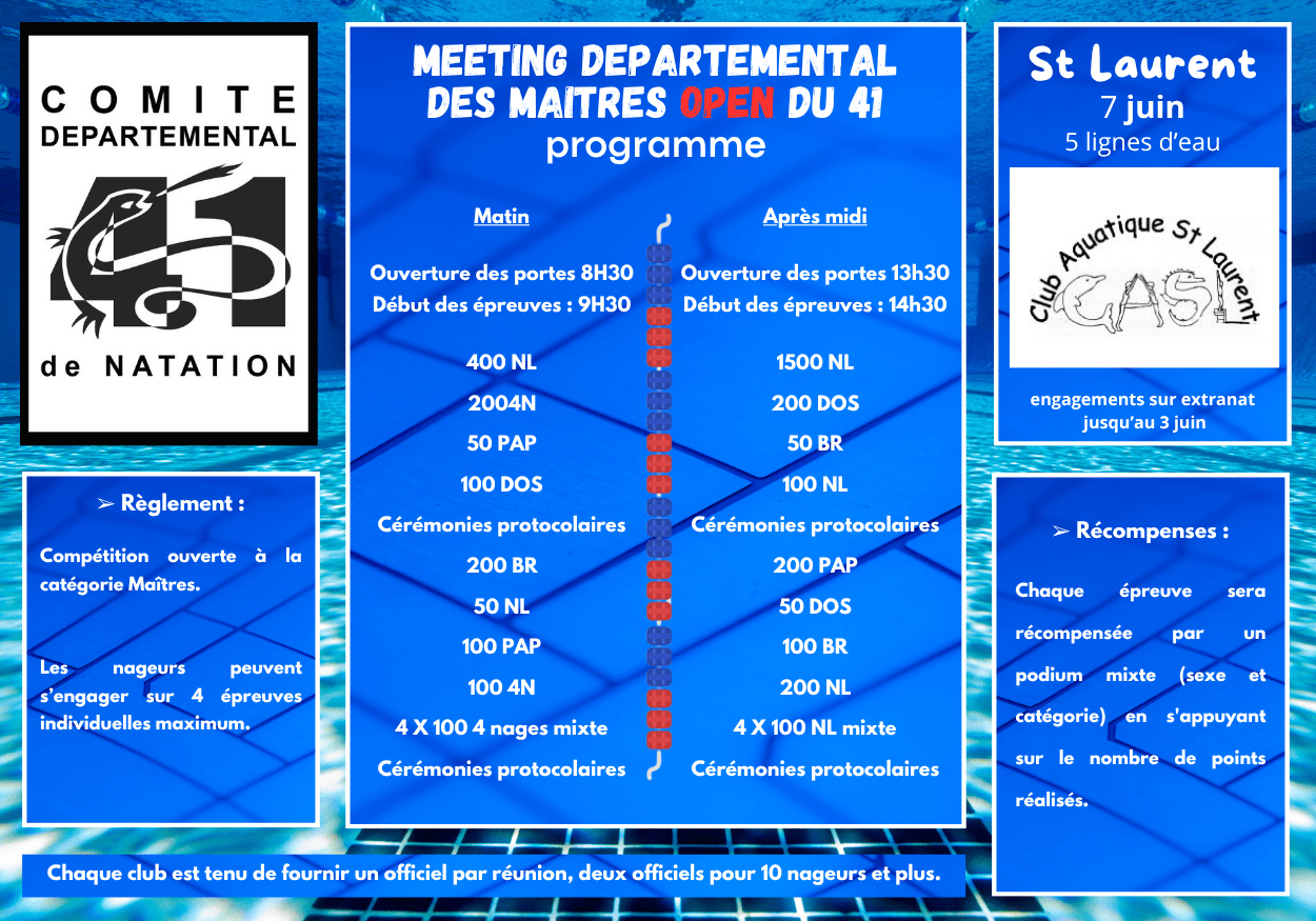 | Maitres | Dimanche. 07 | Championnats départementaux été maîtres | Saint-Laurent-Nouan | FFN | Dép | Oui | Voir | X | X |