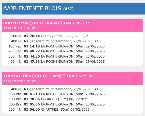 | Benjamin.e, Junior.e, Sénior.e | 22/11 → 23/11 | Départementaux benjamins / juniors: WEB Confrontation | BLOIS | FFN | Dép | Oui | Voir | Voir | Voir |